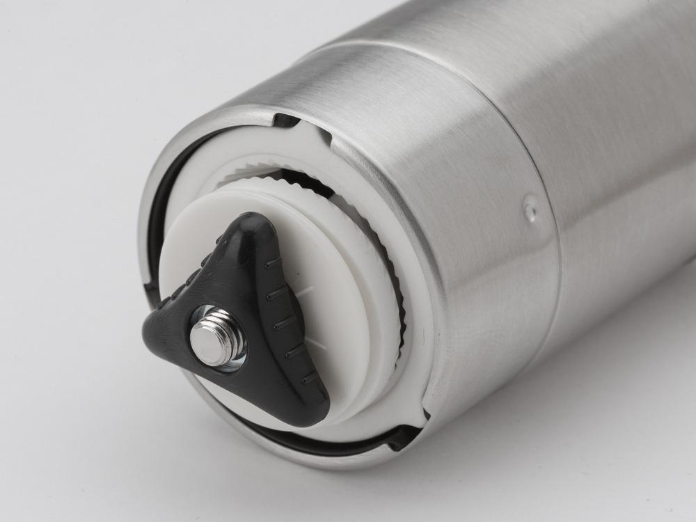 The grinder conveniently folds down to a minimal shape so it can be stowed in the accompanying travel case.